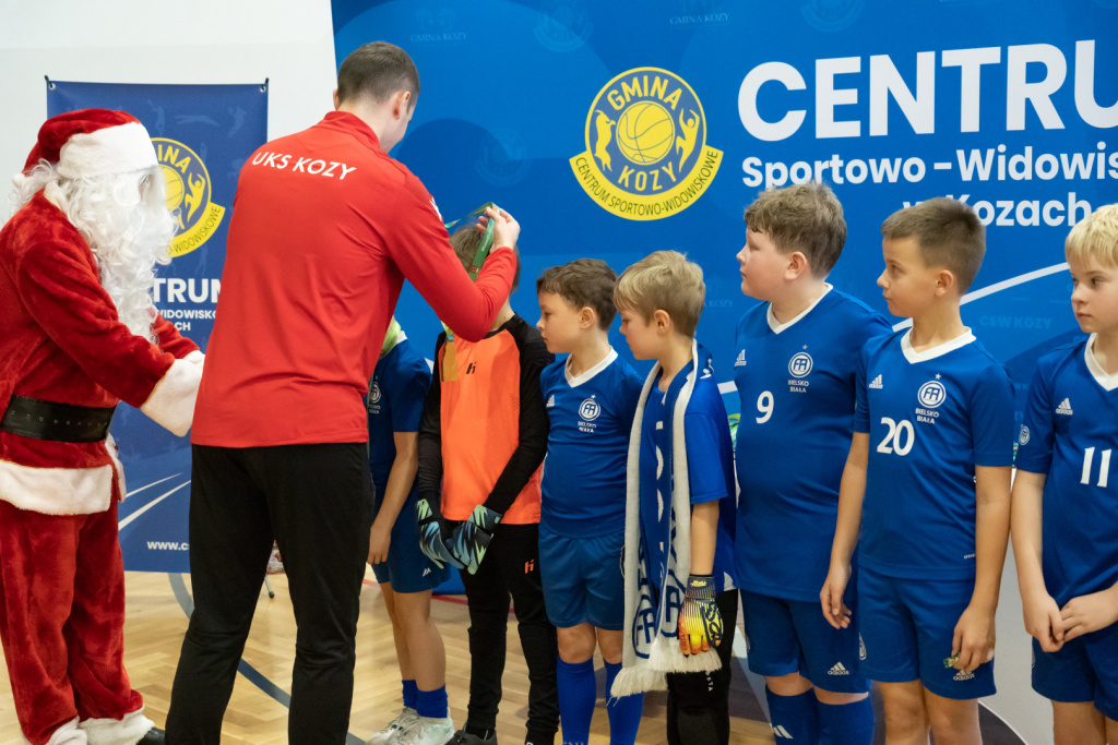 W drugiej części turnieju na boisku pojawił się najbardziej wyczekiwany gość – Święty Mikołaj. Tym razem nie ograniczył się do roli obserwatora. Wziął gwizdek, wbiegł na murawę i posędziował ostatnie spotkanie, wywołując entuzjazm zarówno wśród zawodników, jak i kibiców. Po meczu nadszedł wyjątkowy moment: Mikołaj wręczył pamiątkowe medale wszystkim uczestnikom oraz drobne słodkie upominki, które natychmiast wywołały szerokie uśmiechy.