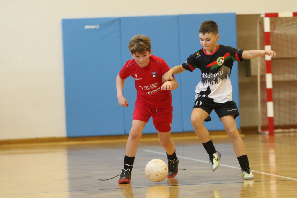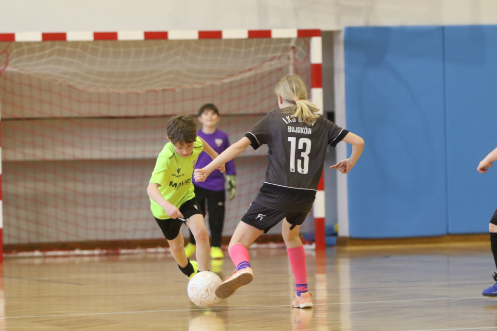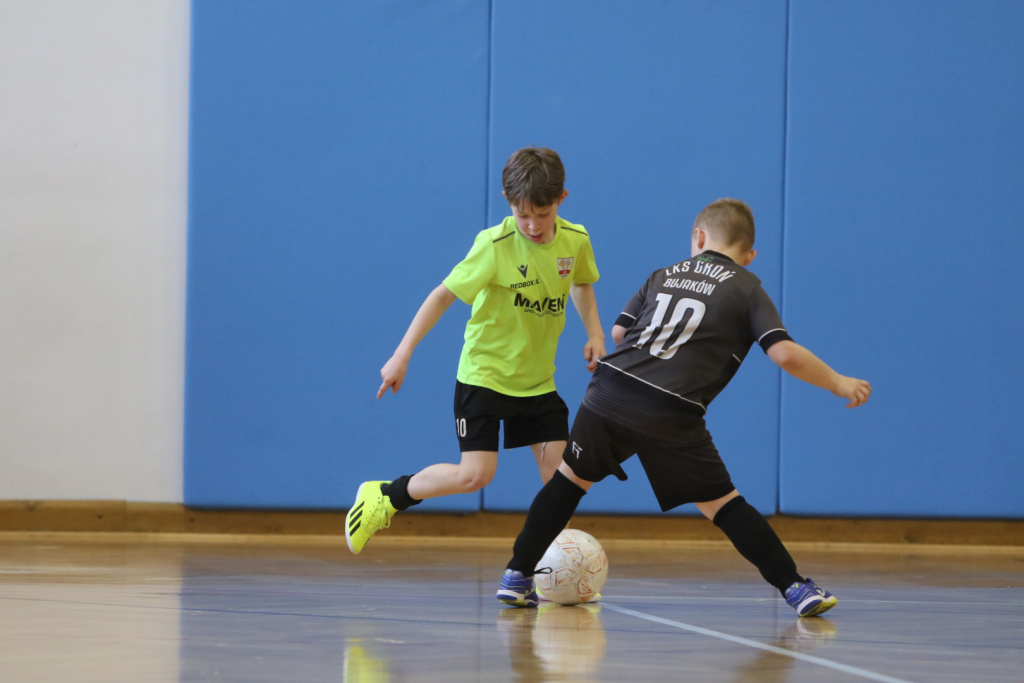 O 11:00 na parkiet wybiegły drużyny Groń Bujaków oraz UKS Dwójka Kozy Neonowy. Lepsze wejście w mecz zanotował zespół z Bujakowa, który wykazał się większą skutecznością. Mimo ambitnych prób ze strony UKS, przewaga rywali okazała się nie do odrobienia i komplet punktów powędrował do Bujakowa.